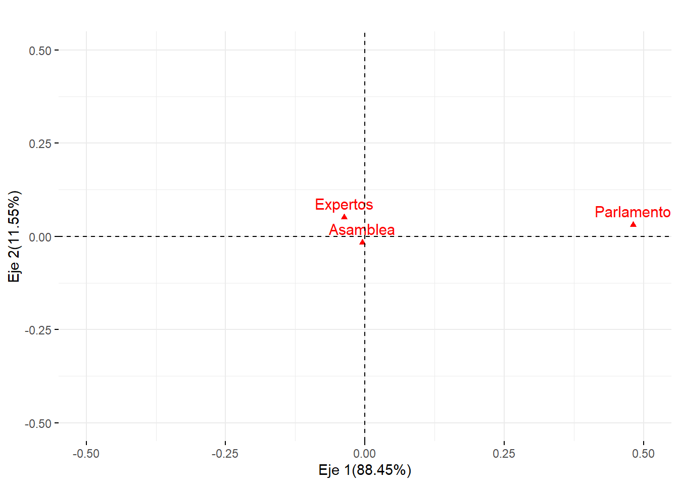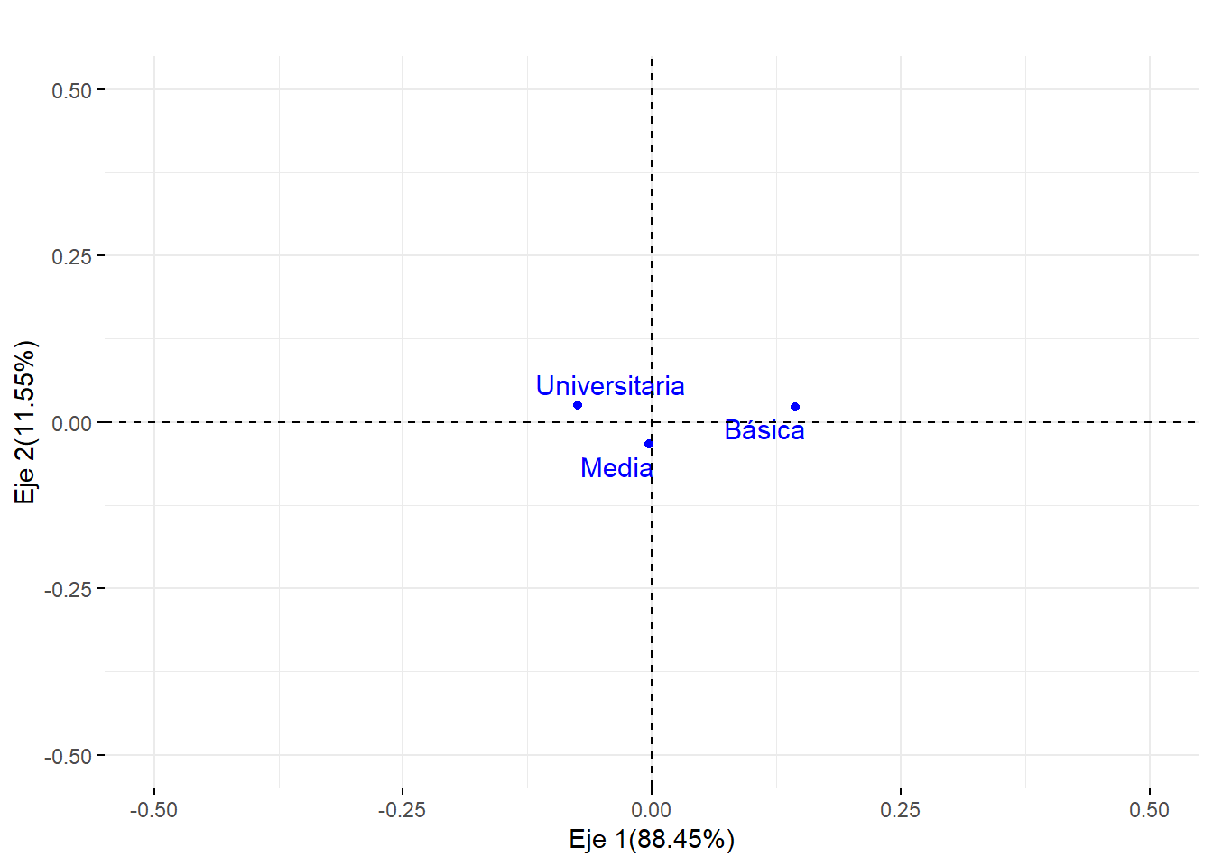 #Nube de individuos columnafviz_ca_col(ACS)+ggtitle("")+ylab("Eje 2(11.55%)")+xlab("Eje 1(88.45%)")+ylim(-0.5,.5)+xlim(-0.5,.5)