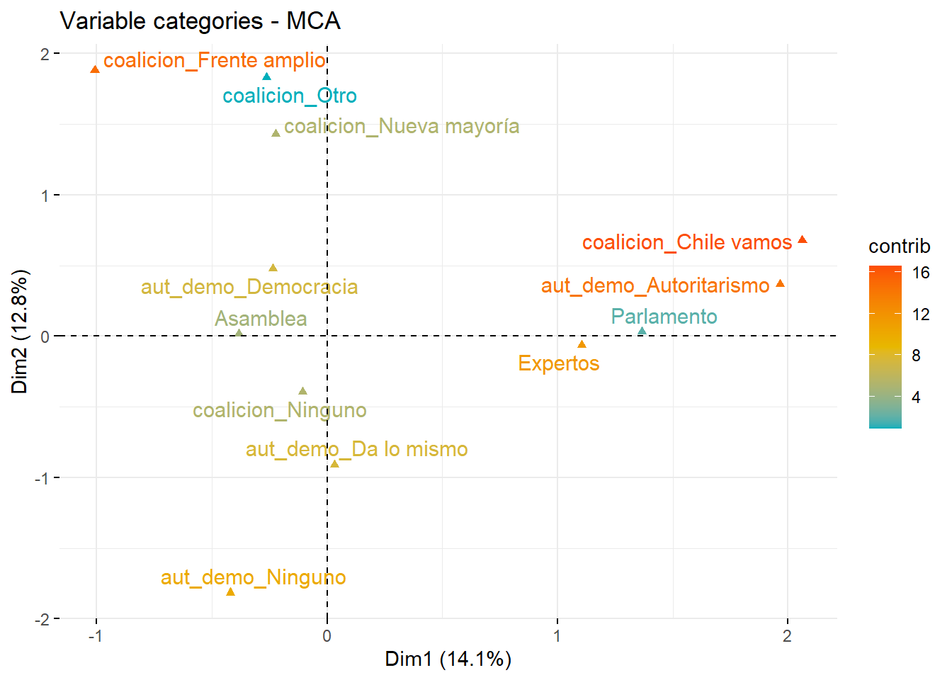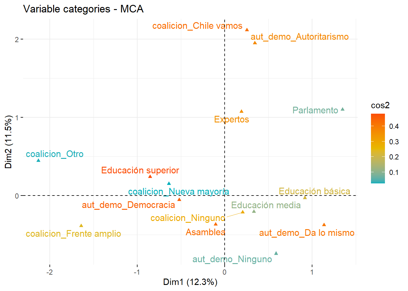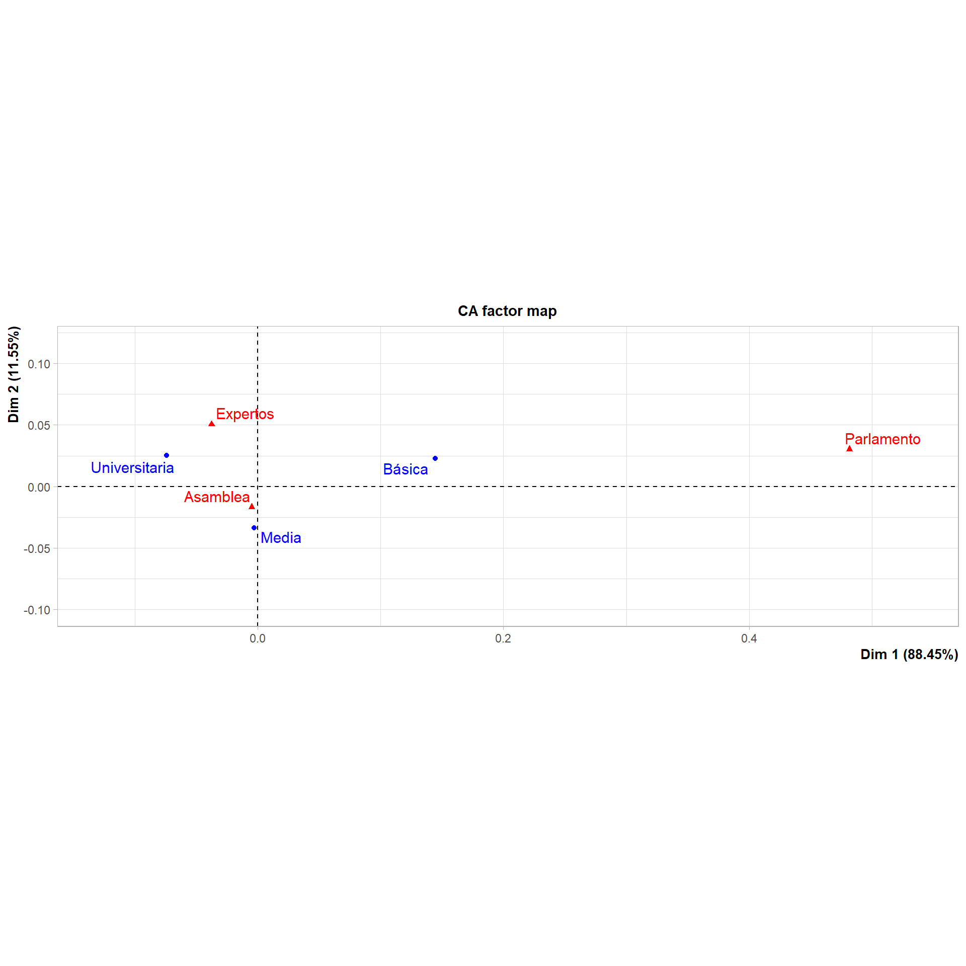 Tenemos las mismas dos dimensiones, una horizontal (Dim 1) que representa el 88.45% de la varianza de nuestras variables y una dimensión vertical (Dim 2) que representa el 11.5% de la varianza. Esto se representa gráficamente en que la mayoría de las variables están más distantes horizontalmente que verticalmente. Además, la mayor contribución a la varianza de la dimensión 1 está por las categorías Universitaria (33.024), Básica (66.923) y Parlamento (94.558)