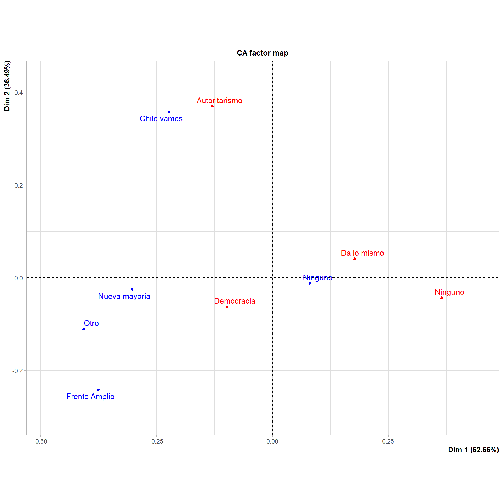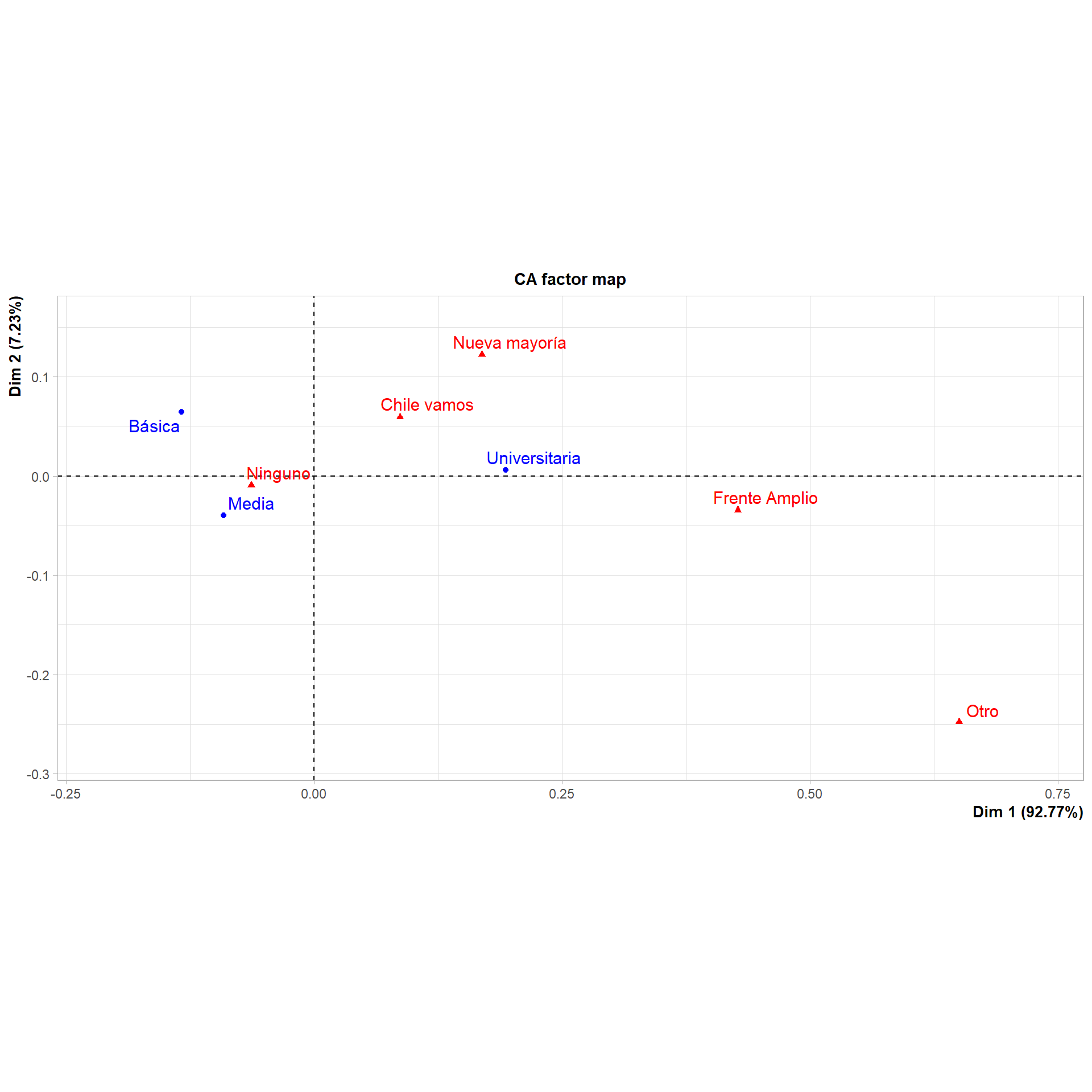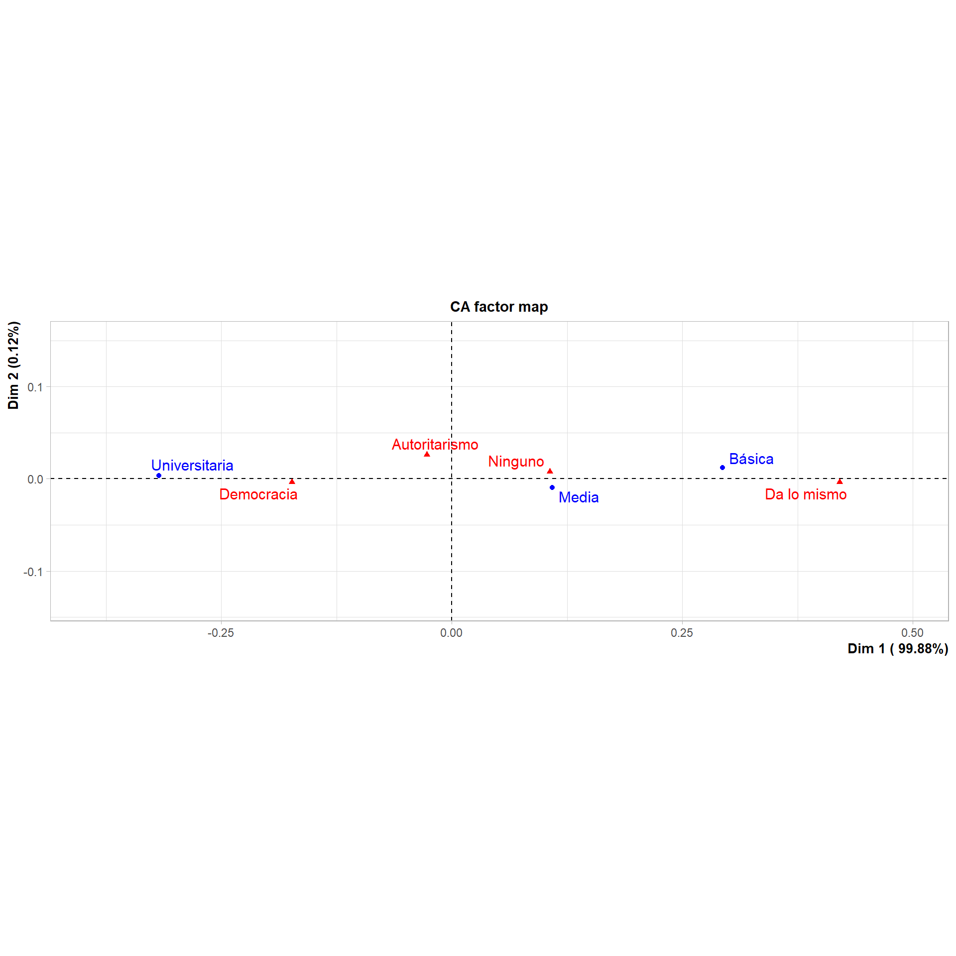 Tenemos las mismas dos dimensiones, una horizontal (Dim 1) que representa el 88.45% de la varianza de nuestras variables y una dimensión vertical (Dim 2) que representa el 11.5% de la varianza. Esto se representa gráficamente en que la mayoría de las variables están más distantes horizontalmente que verticalmente. Además, la mayor contribución a la varianza de la dimensión 1 está por las categorías Universitaria (33.024), Básica (66.923) y Parlamento (94.558)