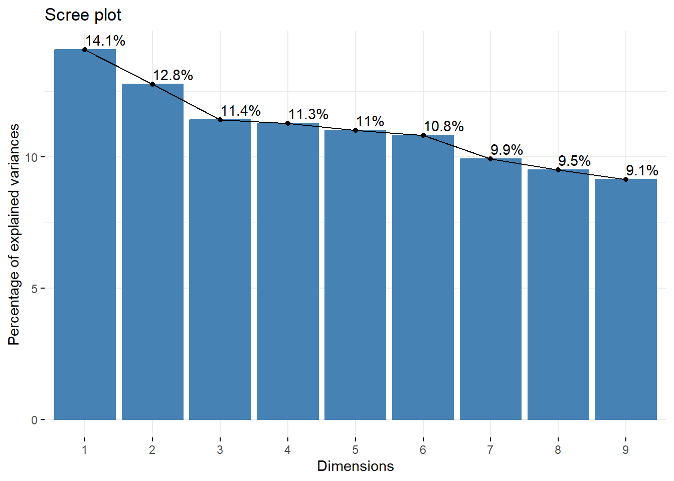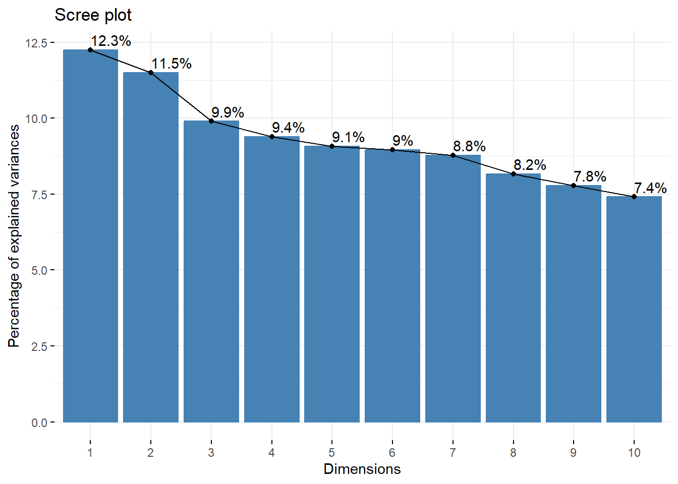 fviz_screeplot(ACM, addlabels =TRUE)